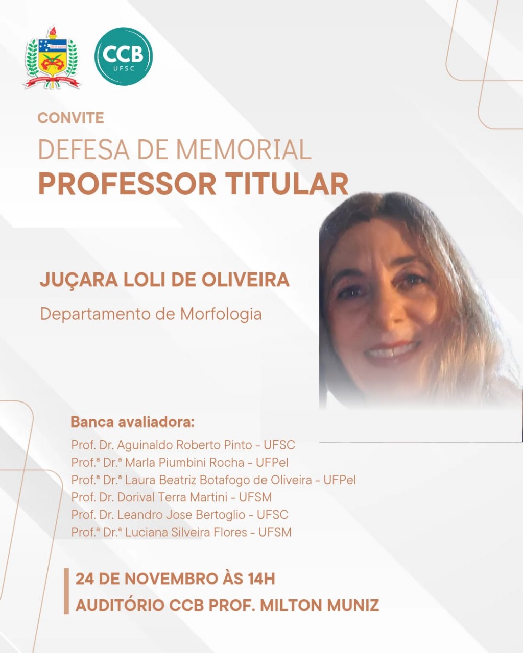 O Departamento de Ciências Morfológicas parabeniza a Professora Juçara Loli de Oliveira por sua promoção à classe de Professora Titular. Este reconhecimento ressalta sua trajetória marcada pela excelência acadêmica, dedicação exemplar e compromisso permanente com o ensino. Sua liderança inspira colegas, estudantes e toda a comunidade universitária. Que esta nova fase seja repleta de conquistas, realizações e ainda maiores contribuições à nossa instituição.